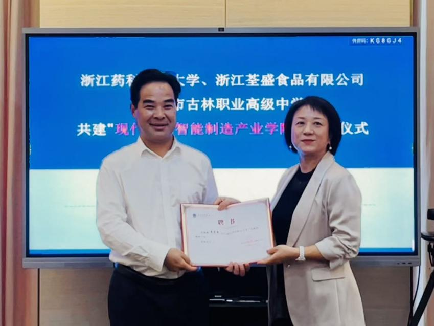 2025年10月23日上午,浙江药科职业大学联合古林职业高级中学和浙江荃盛食品有限公司成功举行共建“现代食品智能制造产业学院”揭牌仪式。学校党委委员、副校长姜宇国,浙江荃盛食品有限公司研发技术总监陈刚、人才引进负责人冉秀清,宁波市古林职业高级中学党总支书记杜浩军、校长刘平,学校人事处、产教融合与社会合作处、食品学院等负责人出席会议。