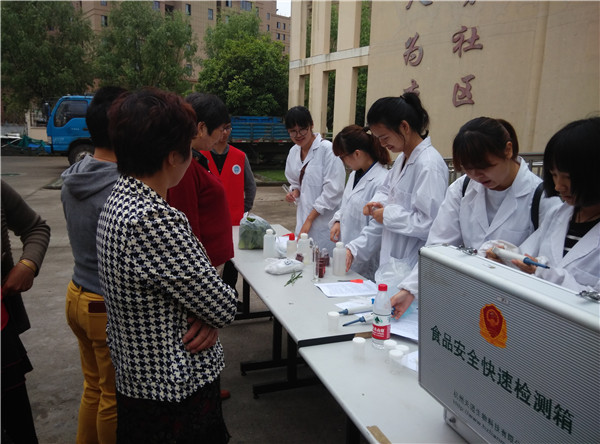 为宣传食品安全知识,提高社区居民的安全意识,让更多的居民买得放心,吃得安心,食品学院学生发挥专业特长,积极投身社区公益活动,将食品快速检测带进了社区。